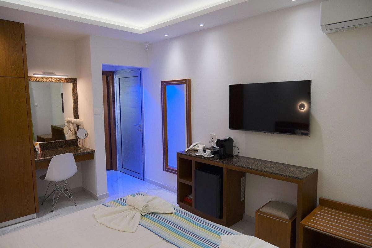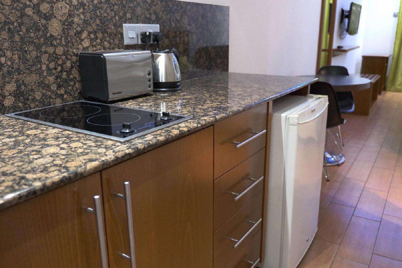 Deluxe stúdió (~28 m2) kényelmesen tágas, praktikusan és modern bútorzattal berendezett, légkondicionált, fürdőszobás, síkképernyős tv-vel, hajszárítóval, telefonnal,