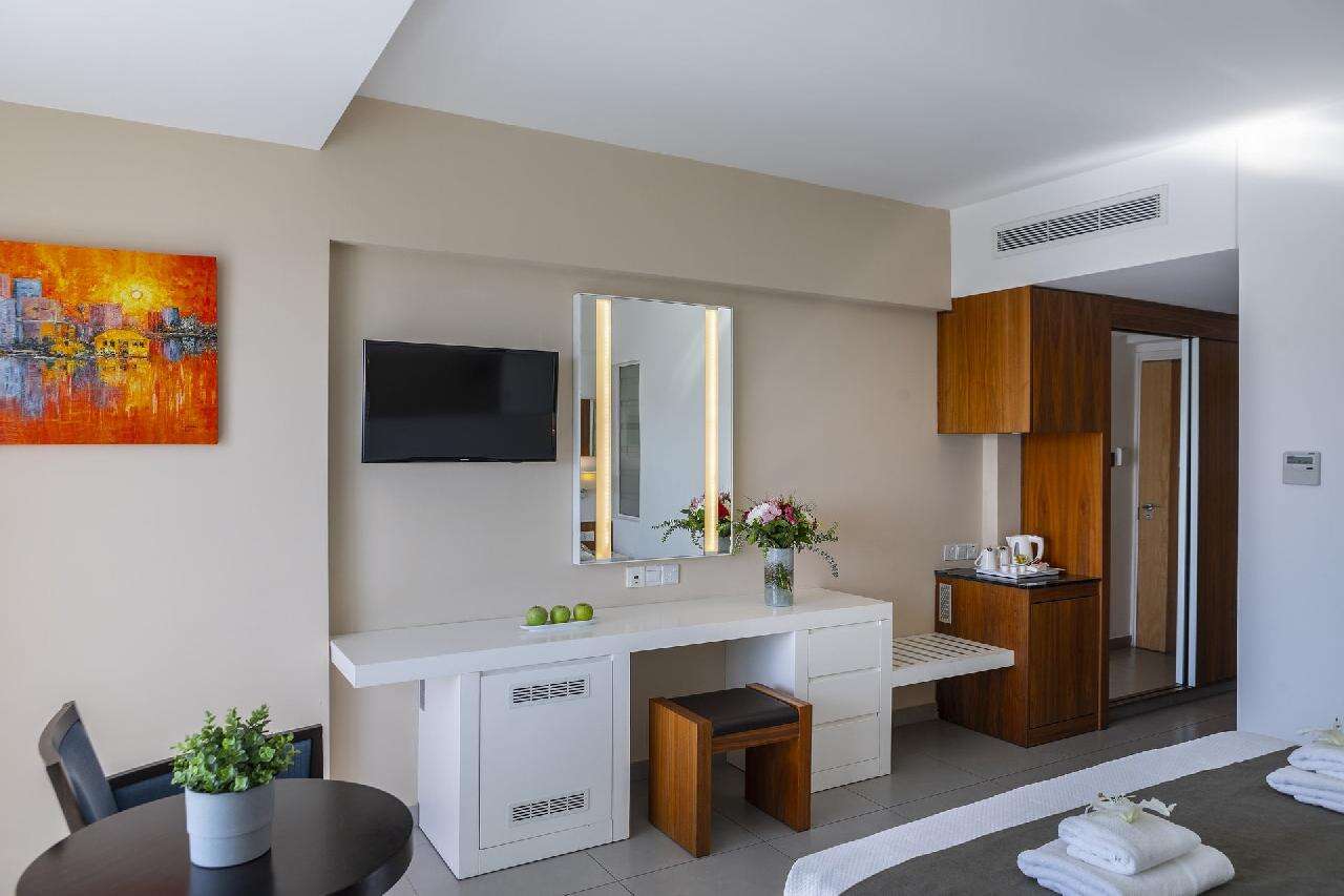 Szobák: minden szuperior szoba modern bútorokkal, stílusosan berendezett, egy hálószobás (~26 m2), légkondicionált, fürdőszobás, hajszárítóval, síkképernyős tv-vel, vízforralóval (tea-, és kávéfőzési lehetőség), minibárral, széffel (térítés ellenében), telefonnal felszerelt. Minden szobához erkély tartozik szárazföldre, oldal tengerre vagy medencére és tengerre néző kilátással.