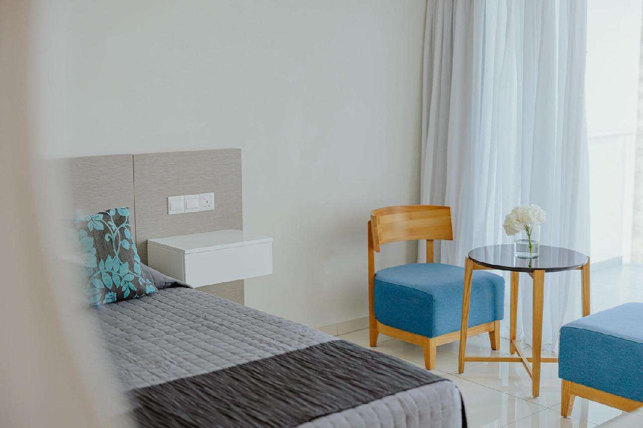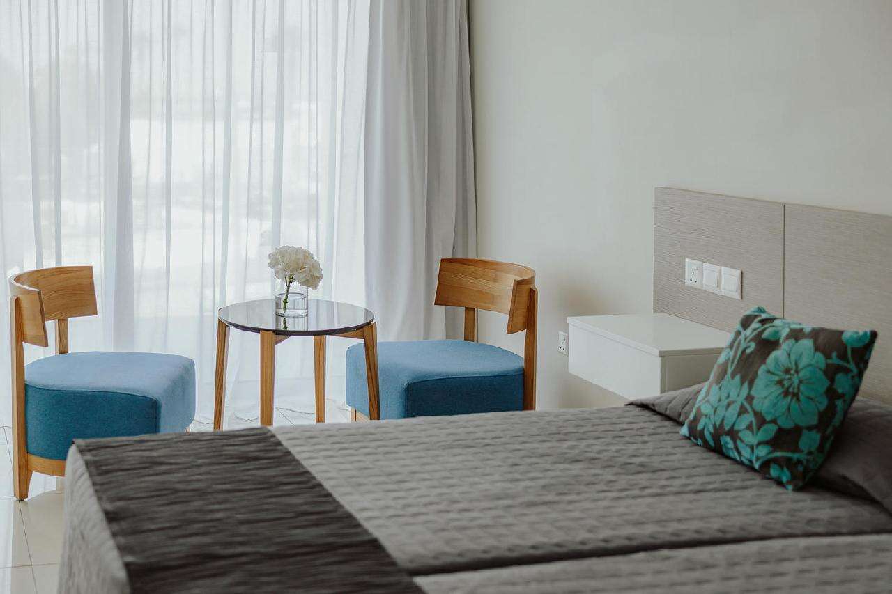 Szobák: minden szoba modern és kényelmes kialakítású, ízlésesen berendezett, egy hálószobás (~23 m2), légkondicionált, fürdőszobás, hajszárítóval, telefonnal, síkképernyős tv-vel és vízforralóval (tea és kávéfőzési lehetőség) felszerelt. Széf és minihűtő térítés ellenében bérelhető. A családi szoba hasonló stílusban és felszereltséggel berendezett, azonban alapterülete nagyobb (~32 m2),kifejezetten alkalmas többtagú családok számára (2 fő díványon). A standard szobákhoz szárazföldre, belső udvarra vagy medencére néző erkély, a családi szobákhoz pedig szárazföldre néző erkély tartozik.