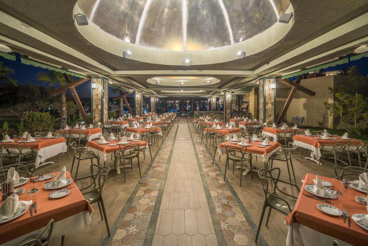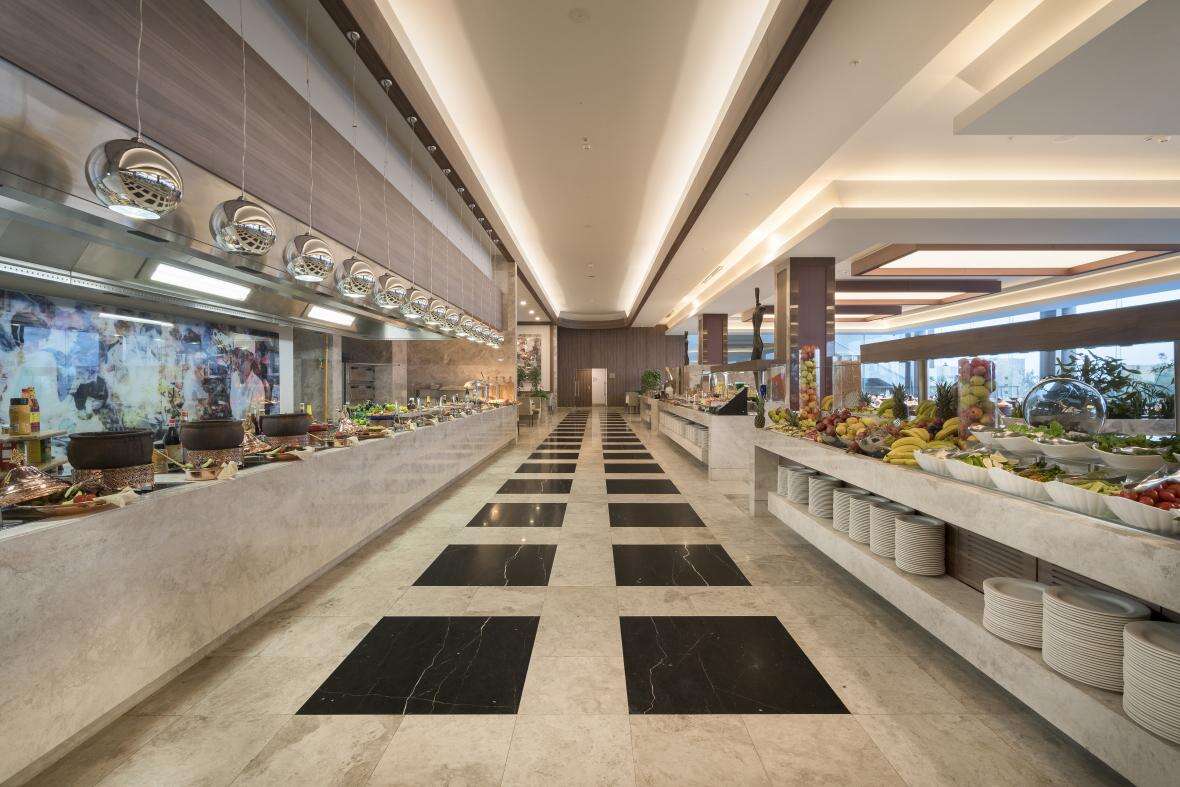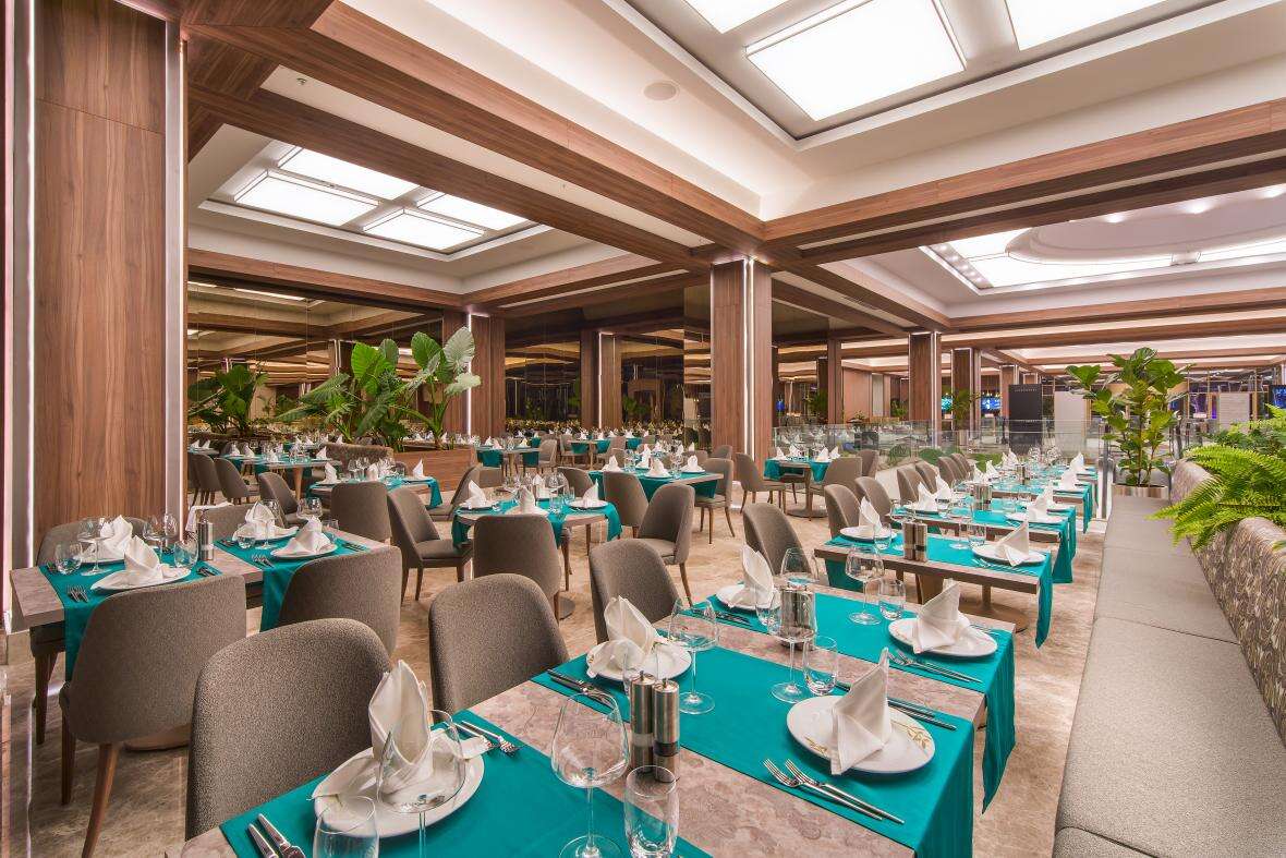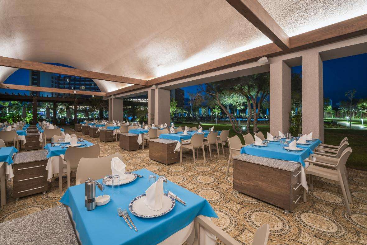 Ellátás: ultra all inclusive ellátás, benne: svédasztalos reggeli (07:00-10:00), késői reggeli (10:0-11:00), svédasztalos ebéd (12:30-14:30), svédasztalos vacsora (18:30-21:30) és éjjeli vacsora (00:00-02:00), könnyű grill ételek, pizzák és tésztafélék a snack étteremben (12:00-16:00), korlátlan és térítésmentes italfogyasztás az étkezések és a szálloda legtöbb bárjában, az italválaszték a szálloda által meghatározott helyi és import prémium márkás alkoholos, alkoholmentes italokra és koktélokra is vonatkozik azonban a palackozott italokra és a frissen facsart gyümölcslevekre nem alkalmazható. Sütemények, kávé és tea fogyasztása a lobby bárban (16.30-18.30), jégkrémek, csúszdapark használata (7 különböző csúszda, 10:00-12:00 és 14:00 -17:30 között), Wi-Fi internetkapcsolat, a sportpályák használata, darts, asztalitenisz, fitneszterem, fedett medence, törökfürdő, szauna és gőzfürdő használata. A megjelölt időpontokon kívül illetve a szálloda egyes bárjaiban és a tematikus éttermeiben a fogyasztás, térítés ellenében.