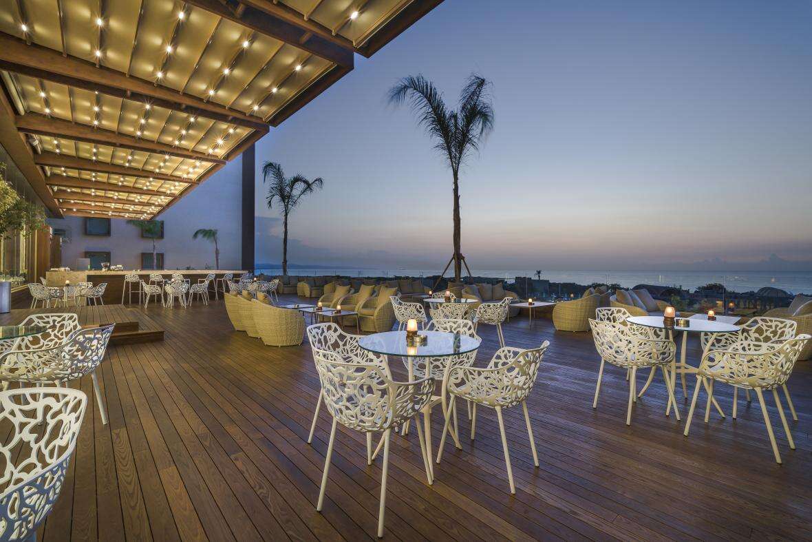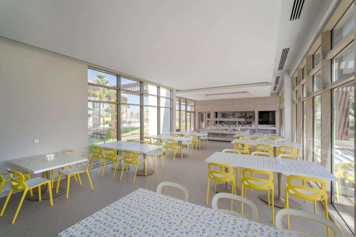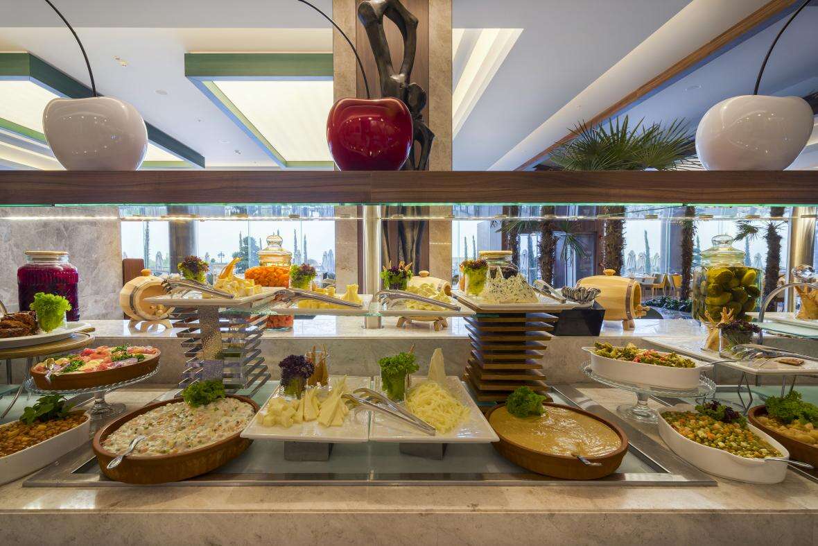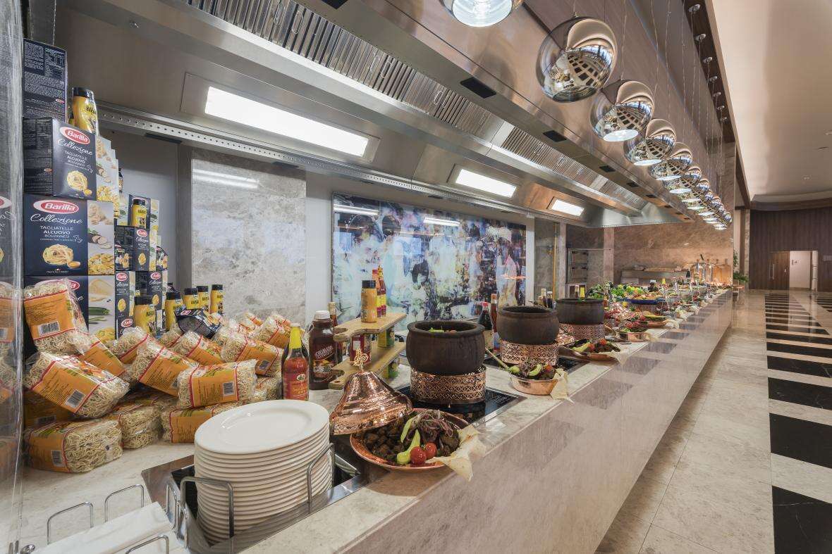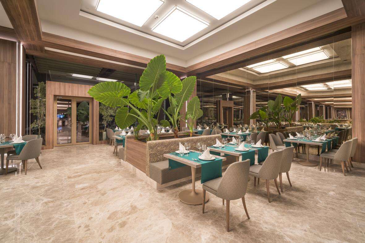 Ellátás: ultra all inclusive ellátás, benne: svédasztalos reggeli (07:00-10:00), késői reggeli (10:0-11:00), svédasztalos ebéd (12:30-14:30), svédasztalos vacsora (18:30-21:30) és éjjeli vacsora (00:00-02:00), könnyű grill ételek, pizzák és tésztafélék a snack étteremben (12:00-16:00), korlátlan és térítésmentes italfogyasztás az étkezések és a szálloda legtöbb bárjában, az italválaszték a szálloda által meghatározott helyi és import prémium márkás alkoholos, alkoholmentes italokra és koktélokra is vonatkozik azonban a palackozott italokra és a frissen facsart gyümölcslevekre nem alkalmazható. Sütemények, kávé és tea fogyasztása a lobby bárban (16.30-18.30), jégkrémek, csúszdapark használata (7 különböző csúszda, 10:00-12:00 és 14:00 -17:30 között), Wi-Fi internetkapcsolat, a sportpályák használata, darts, asztalitenisz, fitneszterem, fedett medence, törökfürdő, szauna és gőzfürdő használata. A megjelölt időpontokon kívül illetve a szálloda egyes bárjaiban és a tematikus éttermeiben a fogyasztás, térítés ellenében.