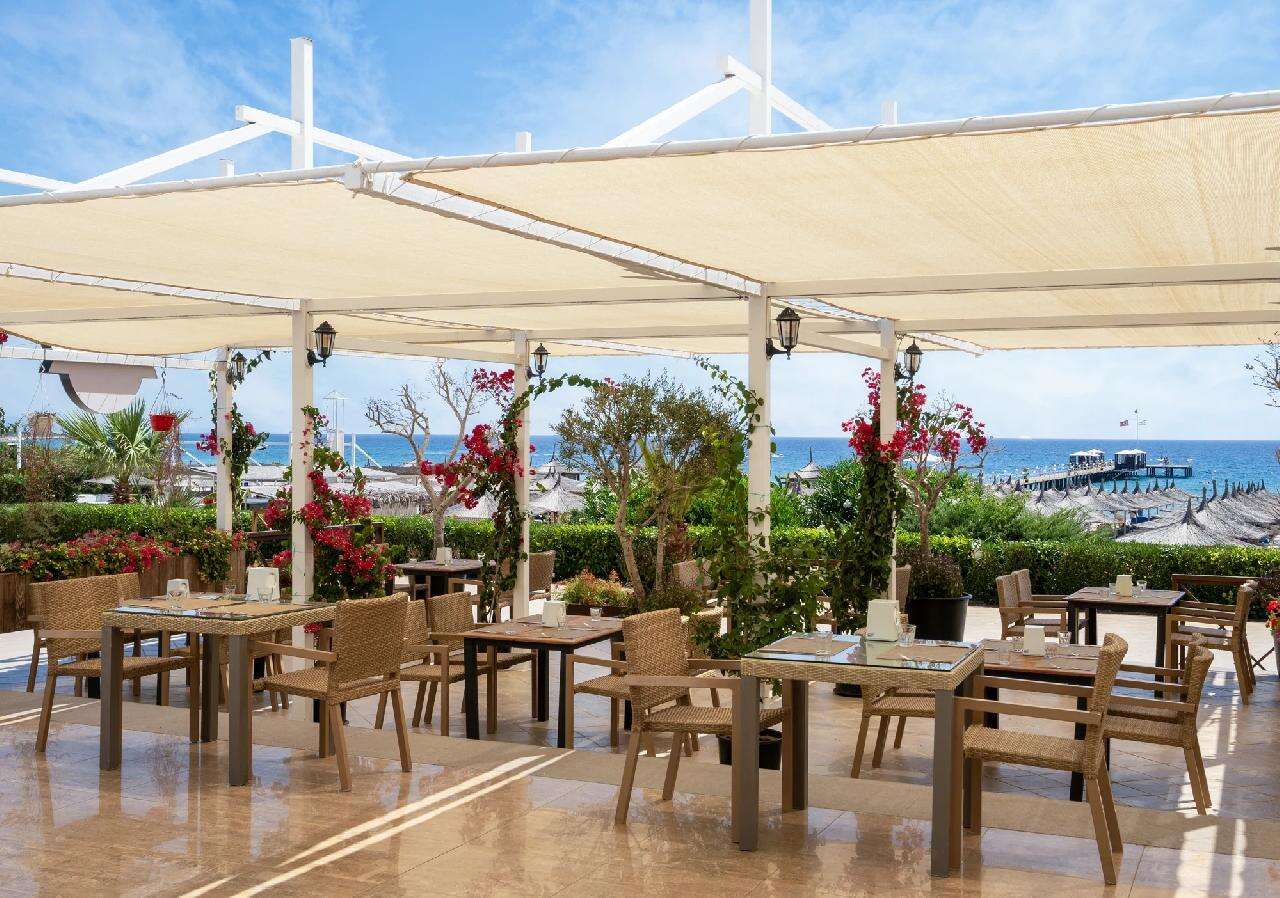 Ellátás: ultra all inclusive ellátás, benne: svédasztalos reggeli (07:00-10:30), késői reggeli (10:30-12:00), svédasztalos ebéd (12:30-14:30), svédasztalos vacsora (18:45-21:30) és éjjeli vacsora (00:00-03:00), könnyű grill ételek, pizzák és tésztafélék a snack étteremben (12:00-16:00), korlátlan és térítésmentes italfogyasztás az étkezések alatt a központi étteremben illetve a Pool (09:00-00:00),; Beach (09:00-19:00); Lobby (09:00-01:00); Artemis (09:00-19:00); Aquapark (10:00-18:00) és a Temple (10:00-19:00) bárokban, az italválaszték a szálloda által meghatározott import prémium márkás italokra és koktélokra, teára, kávéra és török kávéra szól, azonban az a palackozott italokra és a frissen facsart narancslére nem vonatkozik. Sütemények, kávé és tea fogyasztása a lobby bárban (16.30-18.30), jégkrém a snack étteremben (16.00-18.00). Térítésmentes minibár fogyasztás (naponta ingyenes feltöltés, üdítőitalok, ásványvíz és sör), a csúszdapark használata (7 különböző csúszda, a leghosszabb 130m hosszú, 10:00-12:00 és 14:00 -17:30 között), Wi-Fi internetkapcsolat, a sportpályák használata, darts, asztalitenisz, fitneszterem, fedett medence, törökfürdő, szauna és gőzfürdő használata. A strandon privát pavilonbérlésért, vízipipa használatért térítést kell fizetni.