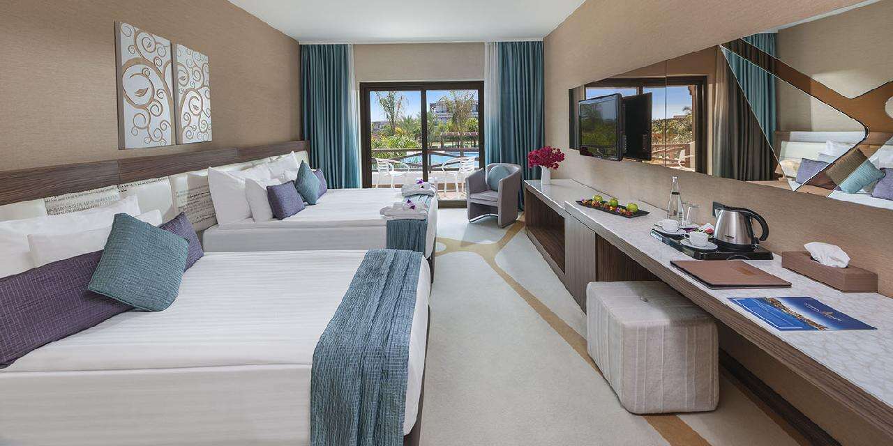 Szobák: minden kerti szoba a bungallóépületekben található egy hálószobás (~34m2) praktikusan berendezett, fürdőszobával, légkondicionálóval, hajszárítóval, síkképernyős tv-vel telefonnal, vízforralóval (tea és kávékészítési lehetőség), szobaszéffel és minibárral felszerelt. A szobákhoz erkély vagy terasz tartozik kertre néző kilátással. Családi szobák felszereltsége hasonló azonban azok két hálószobásak (2 szoba egymás mellett, átjárással, max.5 fő helyezhető el bennük). A főépületi szobák (bárkaépület) hasonló felszereltséggel, szebben berendezettek, szárazföldre, oldaltengerre néző vagy tengerre néző kilátással foglalhatók.