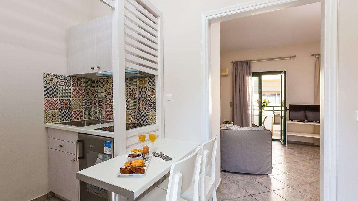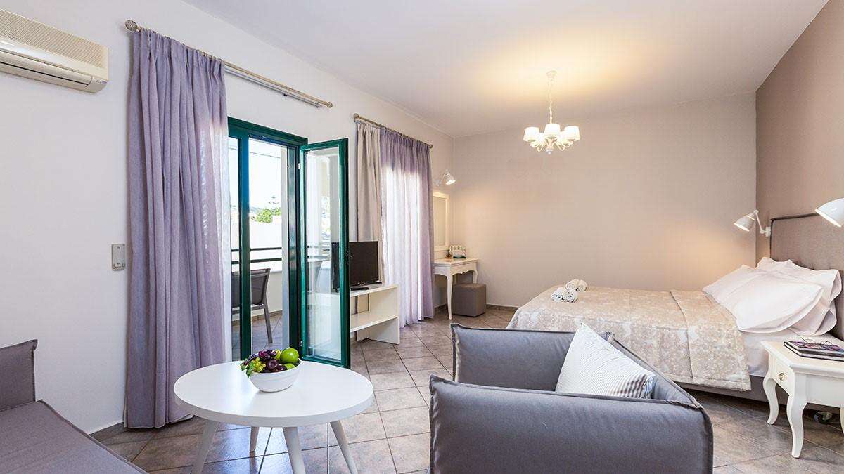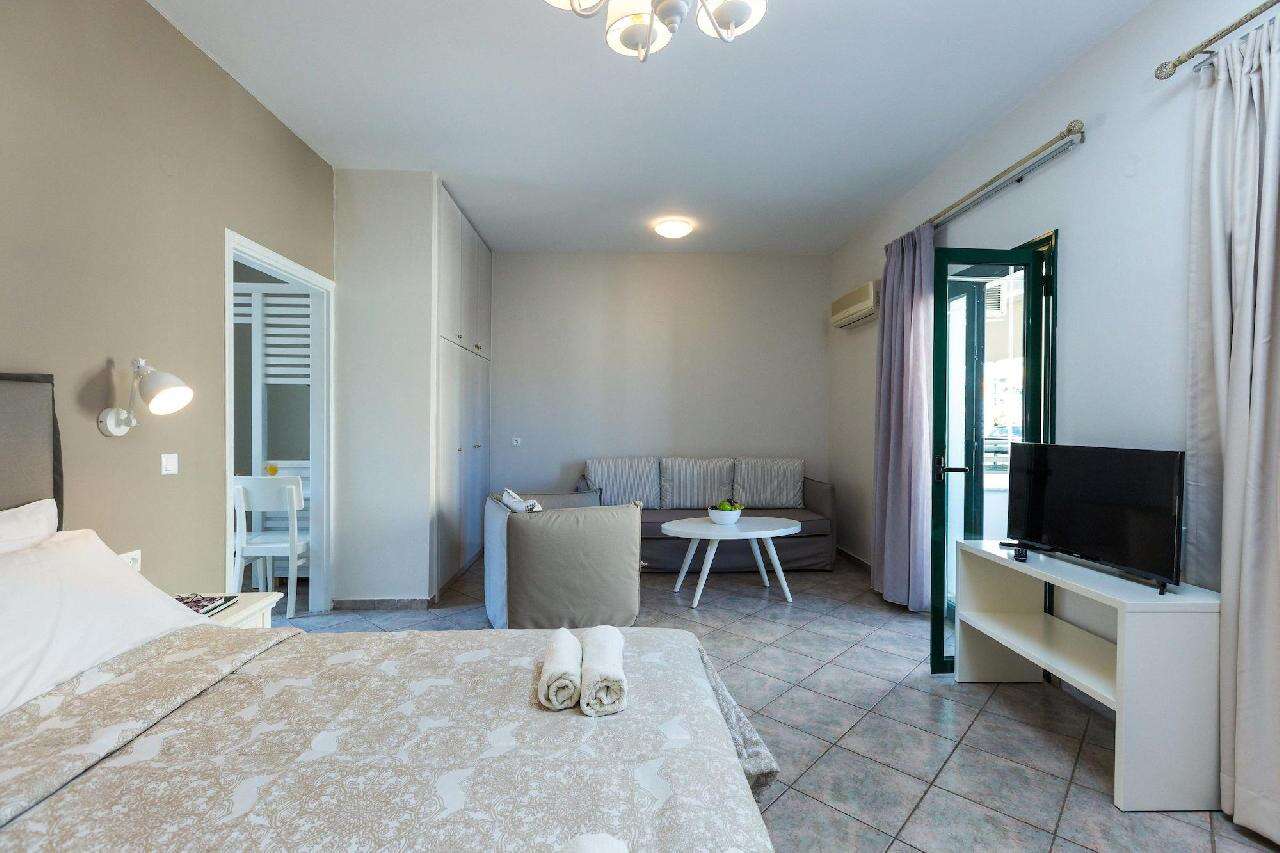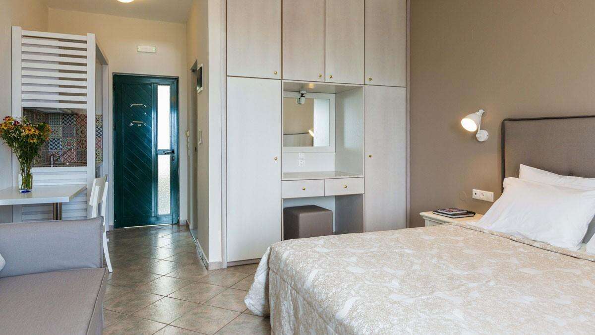 A szálloda komplexuma több épületből áll, összesen 9 stúdióból és 10 apartmanból áll, modern stílusban berendezve. Minden egység légkondicionált, rendelkezik TV-vel, ingyenes Wi-Fi-vel, hűtőszekrénnyel és teljesen felszerelt konyhasarokkal. A fürdőszobák zuhanyzóval vannak felszerelve, és minden stúdió/apartman saját erkéllyel vagy terasszal rendelkezik, ahonnan sok esetben részleges vagy panorámás tengerre néző kilátás nyílik. A stúdiók ideálisak pároknak vagy kisebb családoknak, míg az apartmanok tágasabbak, akár 4 főig is kényelmes elhelyezést biztosítanak.