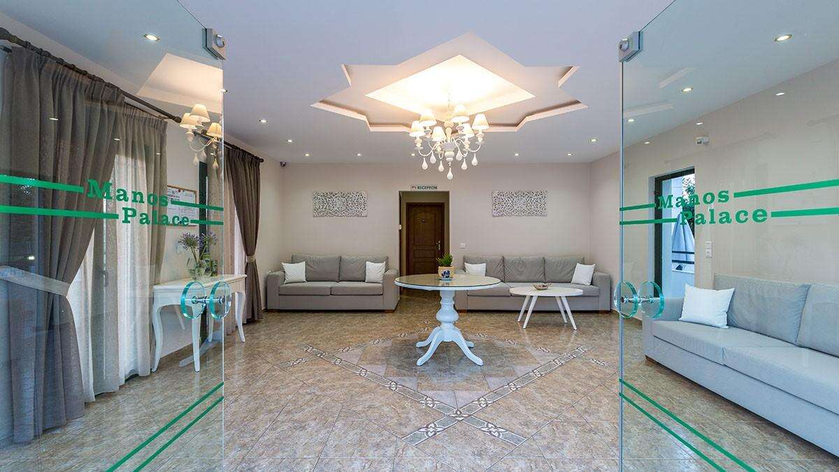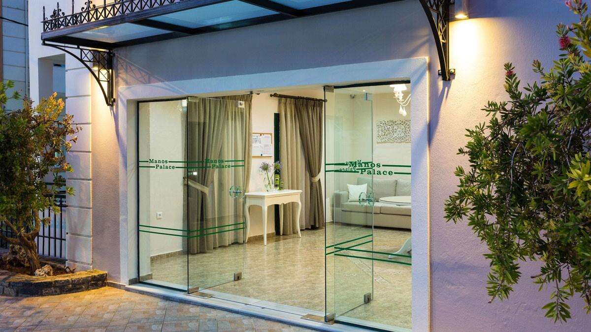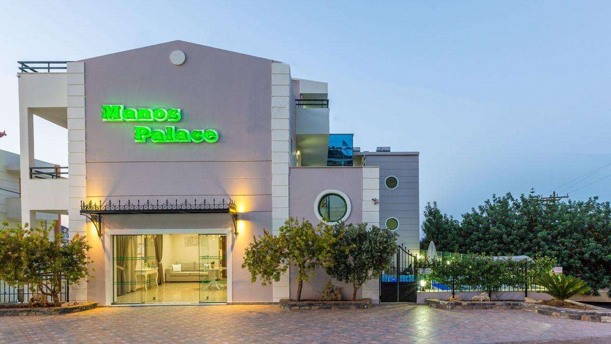 A hotel 24 órás recepcióval, lifttel rendelkezik, valamint ingyenes parkolási lehetőséget kínál a vendégek számára. A Manos Palace kültéri úszómedencével rendelkezik, amelyhez külön gyermekmedence is tartozik, valamint medence körüli napozóágyak és napernyőkvárják a pihenni vágyókat. A tetőterasz (roof garden) hangulatos hely, ahol a vendégek reggelijüket, kávéjukat vagy frissítőiket fogyaszthatják ellenyűgöző tengerre néző kilátással.