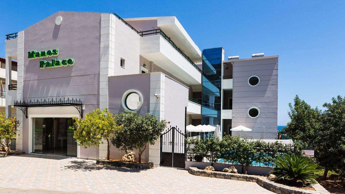 A Manos Palace Hotel Kréta északi partján, a Bali nevű üdülőfaluban található, Rethymno régióban. A hotel csendes, családias környezetben fekszik, mindössze kb. 150–200 m-re a festői homokos-aprókavicsos strandtól, így a vendégek könnyedén elérhetik a tengerpartot gyalogosan. A környéken számos taverna, kávézó és üzlet található, emellett buszmegálló is van a közelben, amivel Rethymno városa és más környező települések is kényelmesen elérhetők. A Heraklion nemzetközi repülőtér kb. 50–55 km távolságra helyezkedik el.