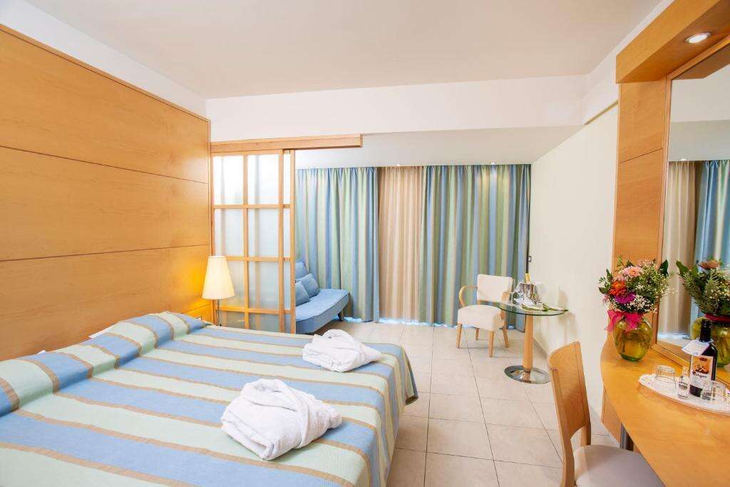 A hotel kényelmesen és ízlésesen berendezett szobákat kínál, melyek légkondicionálóval (nyári szezonban ingyenes), telefon, műholdas TV, hűtőszekrény, fürdőszoba hajszárítóval és erkély vagy terasz tartozékkal rendelkeznek. Bizonyos szobák tengerre nézőek. Széf és egyéb extra szolgáltatások többnyire felár ellenében igényelhetők.